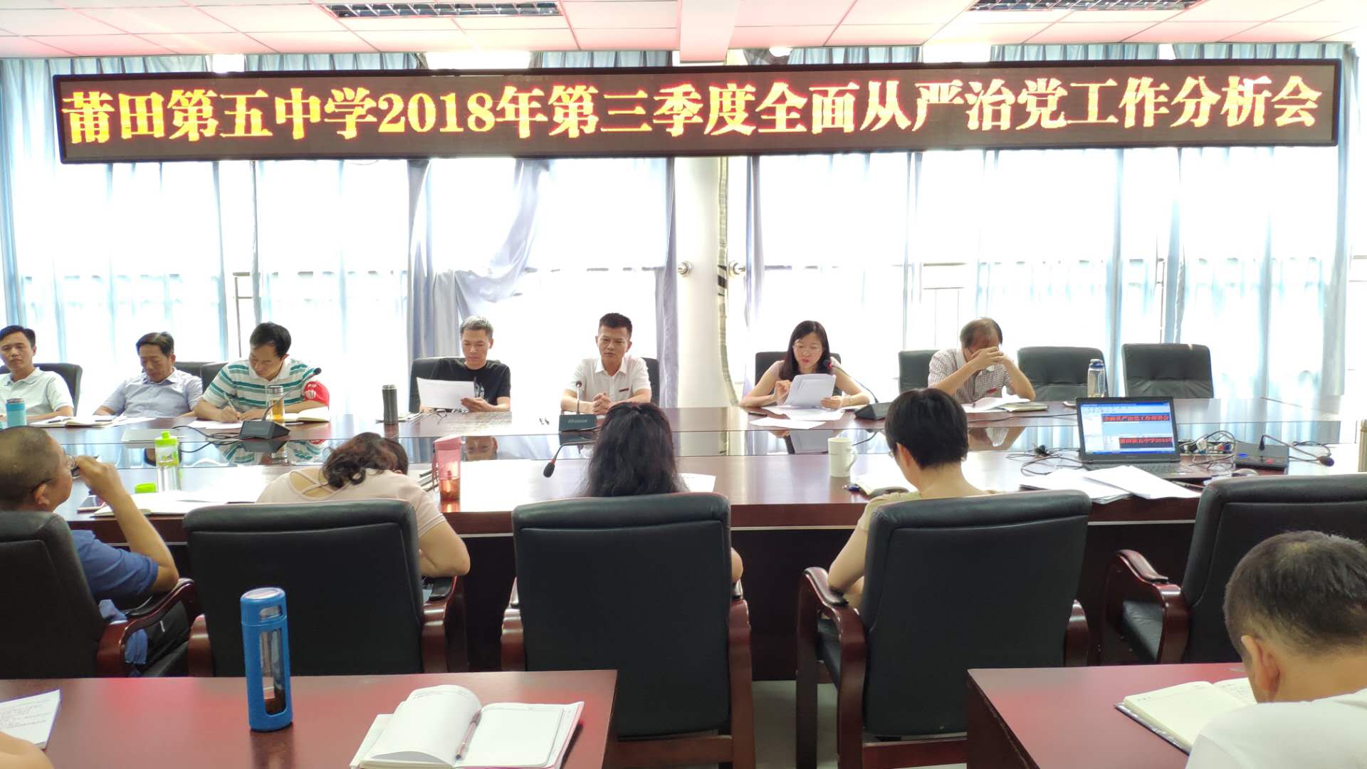 接下来召开莆田五中全面从严治党工作第三季度分析会及第四季度部署会。郑毓青、梁宏晖、傅锦国分别就分管工作中风险点防控措施、落实全面从严治党工作的具体措施进行细致分析,并对第四季度的主要工作进行罗列,同时针对工作可能存在的廉政风险点进行分析与部署。