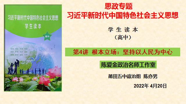 莆田第五中学陈亦男老师,用富有感染力的语言,激情讲授了《读本》第4讲《根本立场:坚持以人民为中心》,通过情境感悟、合作探究等活动引导学生深刻理解党的立场、宗旨和使命。《百年建党》,《习近平的足迹》,《最牵挂的人》三个视频贯穿全课,叩击学生心灵。师生互动、分享体验总书记的为民情怀、共产党的人民立场,共产党人的初心使命。教学中,陈老师注重对学生的情感体验,价值引领,引导学生感悟思想伟力。