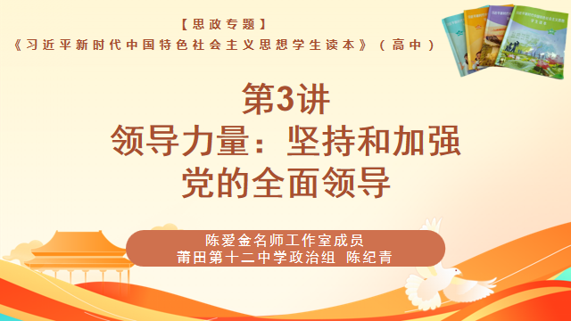 莆田十二中的陈纪青老师,沉着老练,精彩教授《读本》第3讲《领导力量:坚持和加强党的全面领导》。教学中,精心导入视频《中国共产党百年述职报告》,收集脱贫攻坚战的典型事例,学习优秀共产党员的先进事迹,用信念、情感、事实、学理去感染和打动学生,注重《读本》与思政教材的贯通融会,思辨观点独具匠心。马克思主义行、中国共产党能、中国特色社会主义好,层层递进,立意高远。增强“四个意识”,做到“两个维护”成为课堂的主旋律,学生承诺“请党放心、强国有我”溢于言表、直抒胸臆,坚定永远跟党走的信念。
