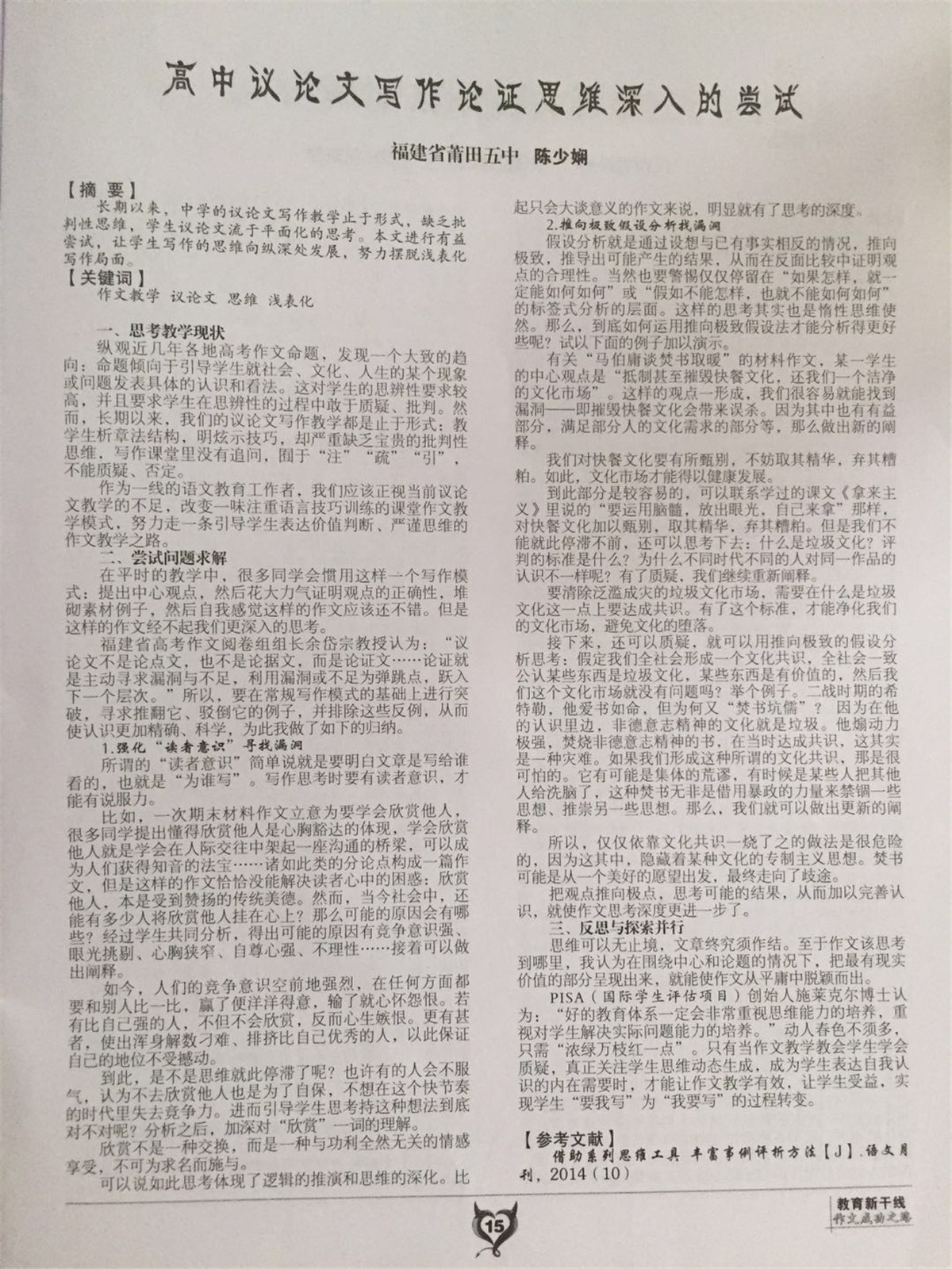 【CN论文】高中议论文写作论证思维深入的尝试-语文组陈少娴
